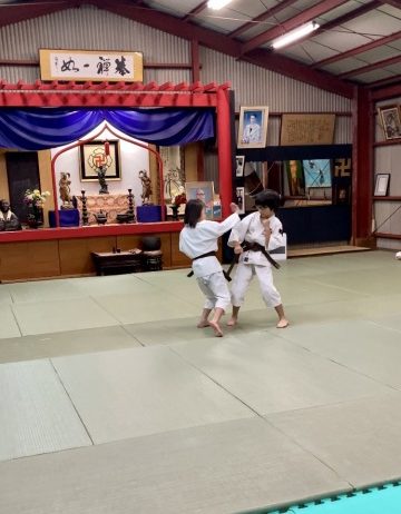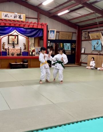 演武発表では、ペアごとが復習を兼ねた構成で取り組み、これまでに習った動きをしっかり確認。